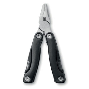Foldable multi-tool in stainless steel with stainless steel pliers. 9 tool functions. 600D polyester pouch included.
