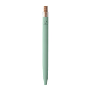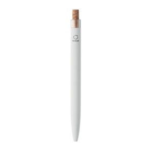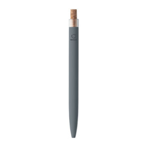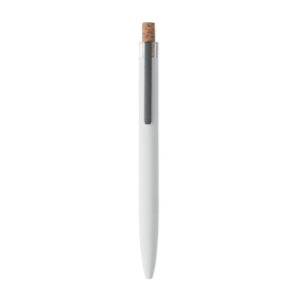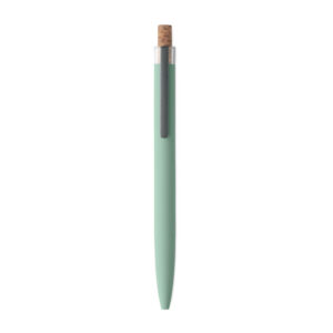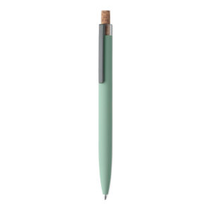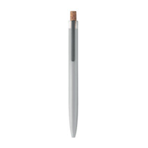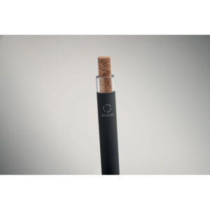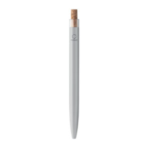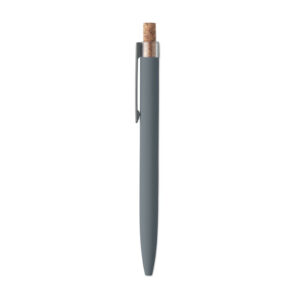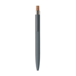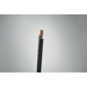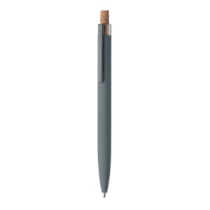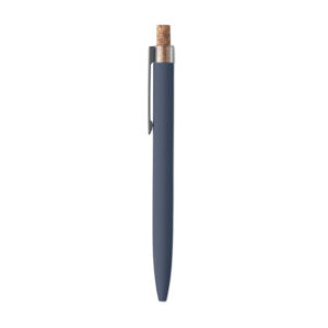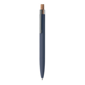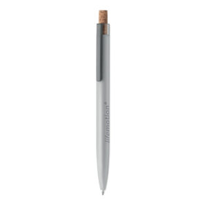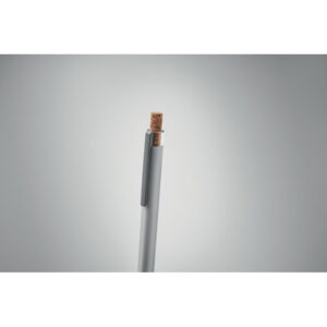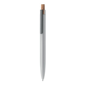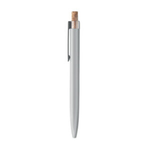 Push ball pen in recycled aluminium with cork detail button and metal clip. Blue ink.