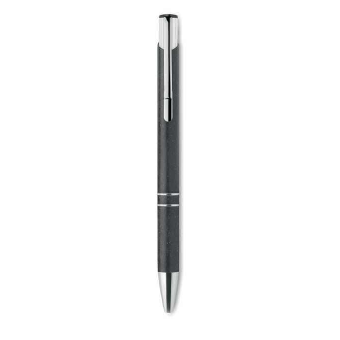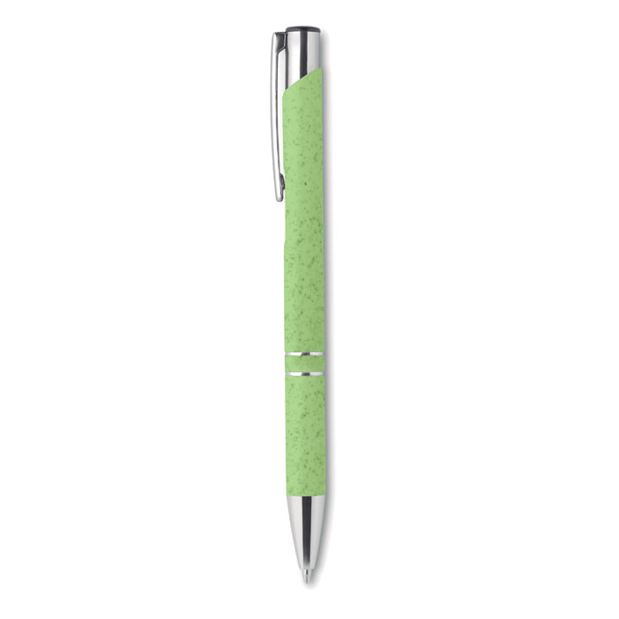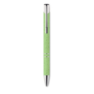 Push button ball pen in 50% wheat straw and 50% ABS material with silver fittings. Blue ink.