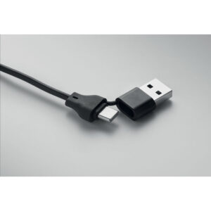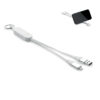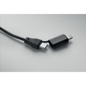 Key ring 4 in 1 data transfer and charging cable 60W with bamboo detail. Input: 2-in-1 Type-C & Type-A. Output: Watch charging (Samsung® and Apple®) , type-C and micro-B (2 in 1 pin).