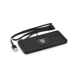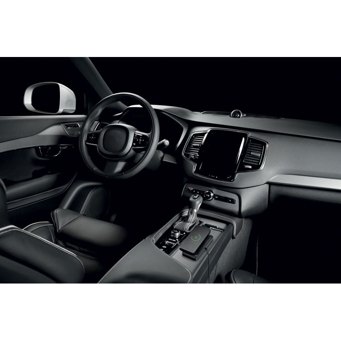 Car wireless charger 15W, anti slip pad in PVC. Adjustable as the edges can be cut to fit the required size. Integrated USB A cable, length 120 cm