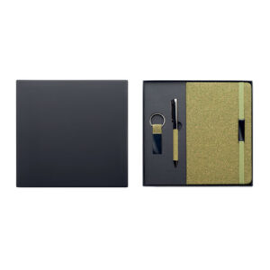 Set of hard cover A5 notebook 160 lined recycled paper pages (80 sheets/70 gsm), twist metal ballpen and keyring. Detail made of 20% tea grounds, 30% cork, 50% polycotton cloth. Metal detail on elastic strap. FSC®-certified | FSC MIX CREDIT, N7.1, FSC-C213206