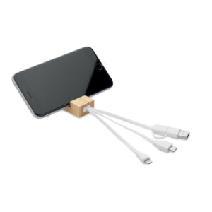 Bamboo key ring with phone stand functionality and integrated charging cable. Input: 2-in-1 Type-C & Type-A. Output: Type-C and micro-B (2 in 1 pin).