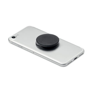 Round shaped foldable phone accessory in ABS with two functions: phone stand and holder. It has 3M sticker on the back.