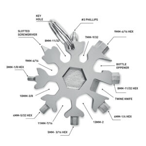 Multi-tool 17-in-1 stainless steel snowflake shaped. Optional metal ring included. This multi-tool is perfect for DIY projects and the amateur handyman. Use the ring to attach it to your toolbelt or other tools.
