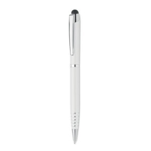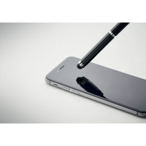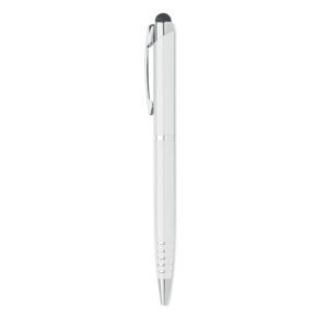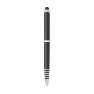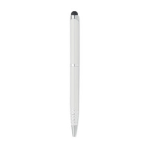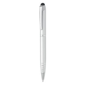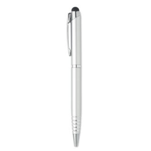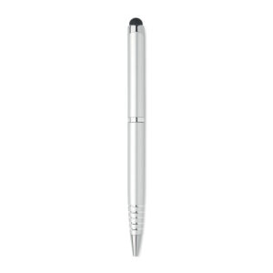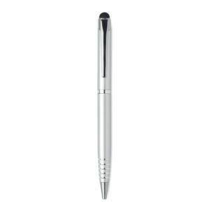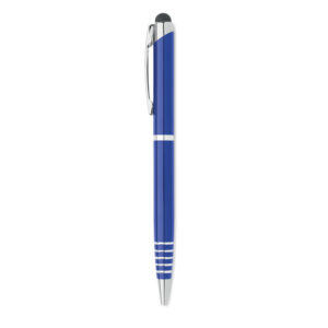 Twist action ball pen in recycled aluminium with stylus. Blue ink.