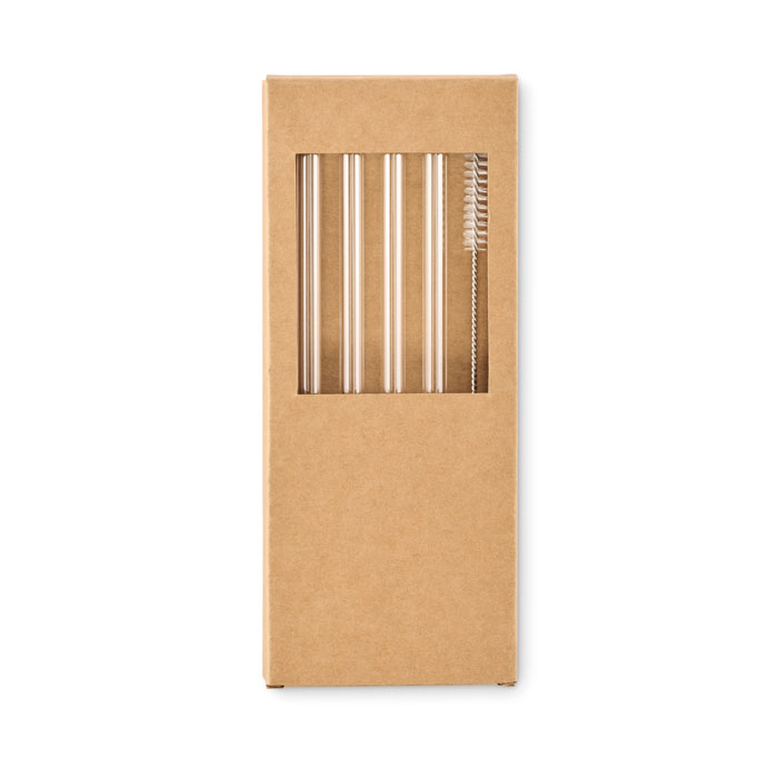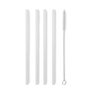 Pack of 4 reusable straws in high borosilicate glass with 1 cleaning brush.