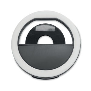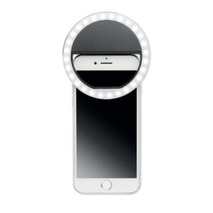 8 cm portable selfie ring light in ABS material with 28 LED’s. White light adjustable to 3 different brightness levels. USB rechargeable 80 mAh battery.