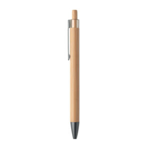 Push button pen with bamboo barrel and metal clip. Blue ink.
