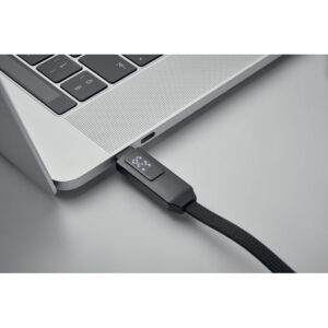 60W charging and data cable with keyring. Type-C to type-C with LED screen with charging power display feature. Magnet closure.