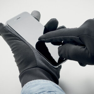 Tactile sport gloves for smartphone in polyester. Two fingers with touch function with anti-slip dots on palm and finger in PVC.