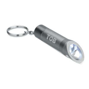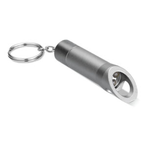 Metal LED torch key ring with bottle opener. 3 cell batteries included.