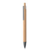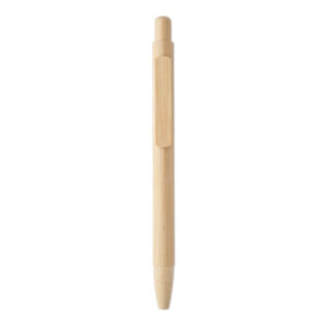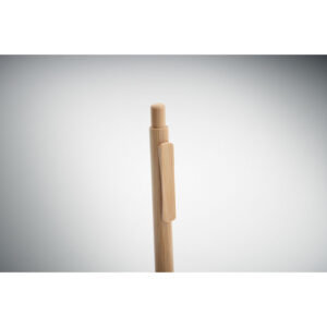 Push button pen with bamboo barrel, tip, clip and body. Blue ink.
