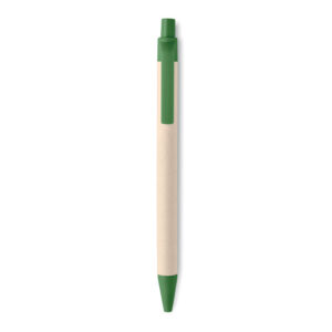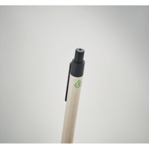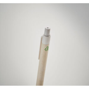 Push button ball pen with recycled milk cartons barrel (70 % recycled milk carton and 30% recycled paper) and PLA parts (in 100% biodegradable corn). Blue ink.