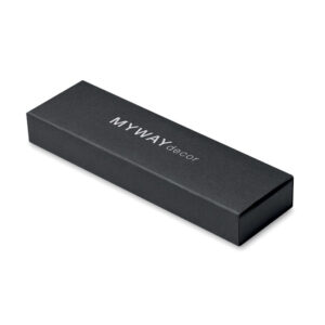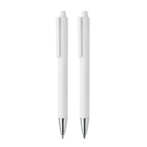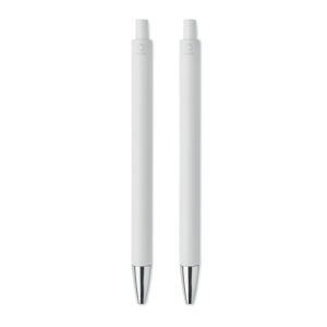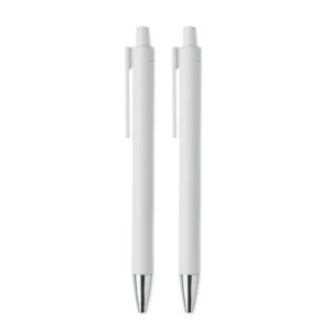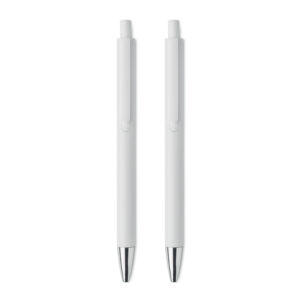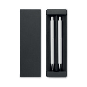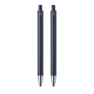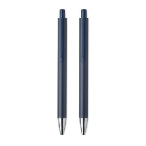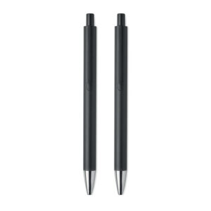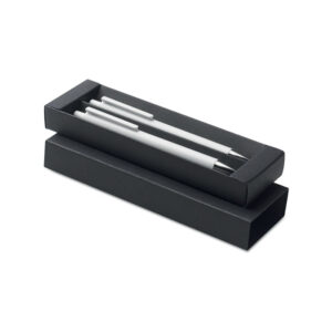 Recycled aluminium pen set with 1 push button ball pen and 1 graphite inkless pen. Blue ink. Presented in recycled paper box.