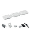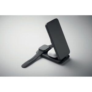 3 in 1 ABS charging station. Magnetic wireless charger 15W with phone stand, TWS charger and smartwatch charger (Apple® only). Compatible with iPhone® 12 and newer. With additional magnetic metal ring to support charging of non-magnetic wireless chargeable phones.
