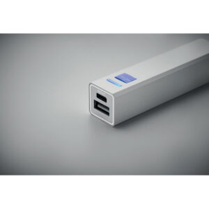 Powerbank . 2600 mAh. Recycled aluminium (GRS). Outputs: USB-C and USB-A up to 10W. Input: USB-A 10.5W. USB-C to USB-C cable (2A) with USB-A adapter included.