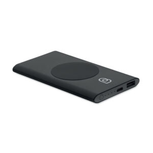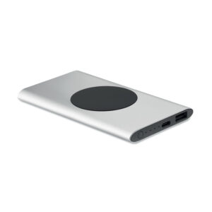 Wireless powerbank. 5000 mAh. Recycled aluminium and ABS (GRS). PD 18W. Outputs: USB-C 20W and USB-A up to 18W. Wireless charging up to 15W. Input: USB-C 18W. USB-C to USB-C cable (2A) with USB-A adapter included.
