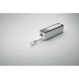 Powerbank with flashlight. 5000 mAh. ABS. Outputs: USB-C and USB-A up to 10W. Input: USB-C 10W. 6 COB lights (18 lm each). Built-in USB-C cable to USB-C cable with USB-A adapter included.