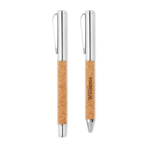 Metal pen set with ball pen (twist mechanism) and roller ball (open cap) with cork barrel. Presented in matching cork box. Blue and black ink respectively. Cork is a natural material, due to its structural nature and surface porosity the final print result per item may have deviations.