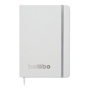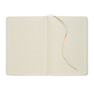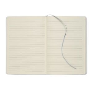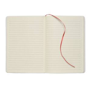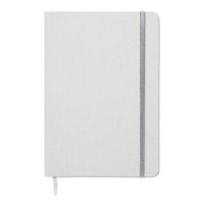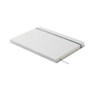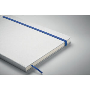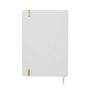 A5 notebook with hard cover made of 70% recycled milk carton pack and 30% recycled paper. White cover. Casebound. 160 lined recycled paper pages (80 sheets). Elastic closure strap, ribbon bookmark matching with revealed colour. After laser engraving the colour is revealed.