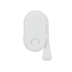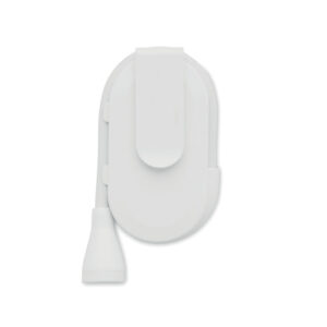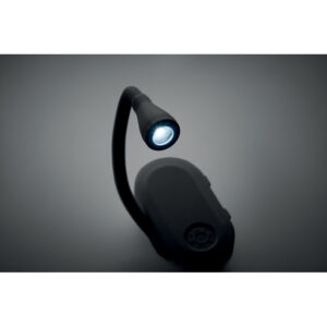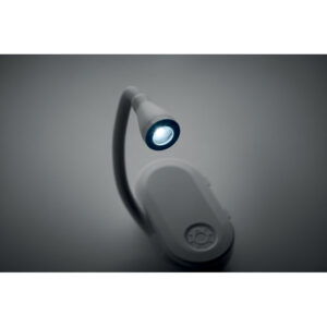 Rechargeable LED book light in ABS with flexible body and clip. Features 3 light settings, 300mAh battery.