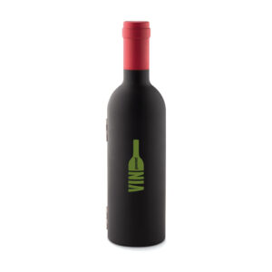 Wine set presented in bottle shaped box. With wine stopper, corkscrew and anti drip collar. Magnetic closing.