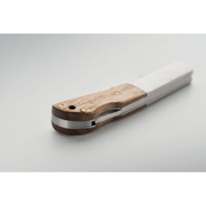 Stainless steel foldable knife in acacia wooden handle. Blade length: 6 cm.
