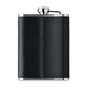 Slim hip flask in stainless steel with PU-leather cover. 200 ml capacity.