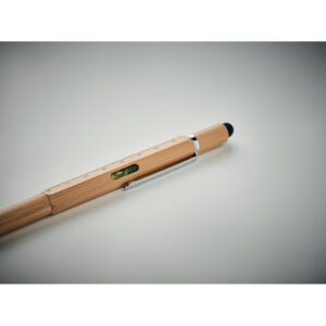 Twist action spirit level pen in bamboo with 7 cm ruler, stylus and Phillips head and flat head screw driver bits. Blue ink. Bamboo is a natural product, there may be slight variations in colour and size per item, which can affect the final decoration outcome.
