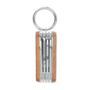 Stainless steel multi tool pocket knife with acacia wooden handle. 7 functions: bottle opener, knife, can opener, file, screwdriver bits, key ring and 1 LED light. 3 button cells included.